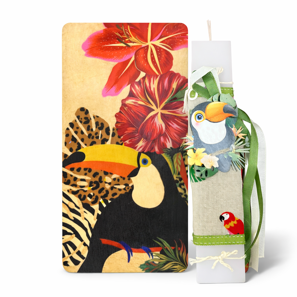 Συνοδεύεται από διακοσμητικό καδράκι με εντυπωσιακό toucan και τροπικά λουλούδια, το οποίο μπορεί να χρησιμοποιηθεί μετά το Πάσχα ως όμορφη διακόσμηση για το παιδικό δωμάτιο.