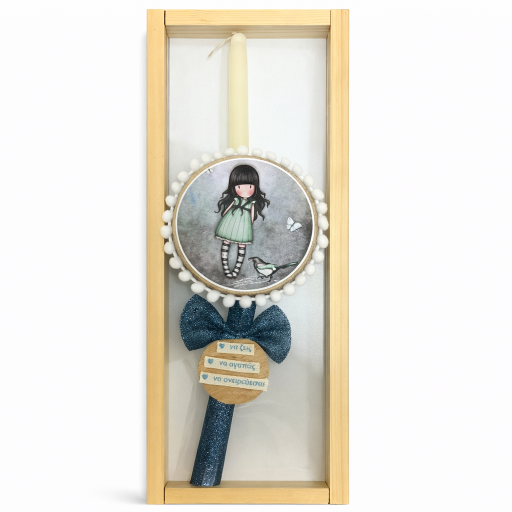 Η λαμπάδα είναι διακοσμημένη με ένα γλυκό κοριτσάκι σε ρομαντικό στυλ, πλαισιωμένο από μικρές λεπτομέρειες όπως πεταλούδες και διακοσμητικά πομ-πομ, που δημιουργούν μια παραμυθένια και τρυφερή αισθητική. Στο κάτω μέρος υπάρχει ένα ξύλινο στοιχείο με ευχές: