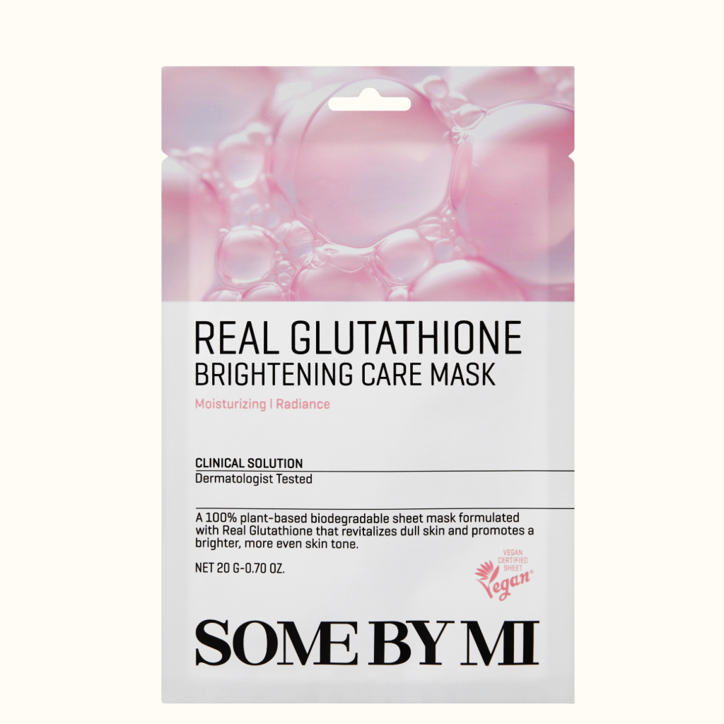 Μάσκα για πανάδες με Γλουταθιώνη. Η Somebymi Real Glutathione Brightening Care Mask είναι μία λευκαντική μάσκα ενυδάτωσης, λάμψης και αντιγήρανσης με Γλουταθειόνη, Υαλουρονικό Οξύ και Νιασιναμίδη.