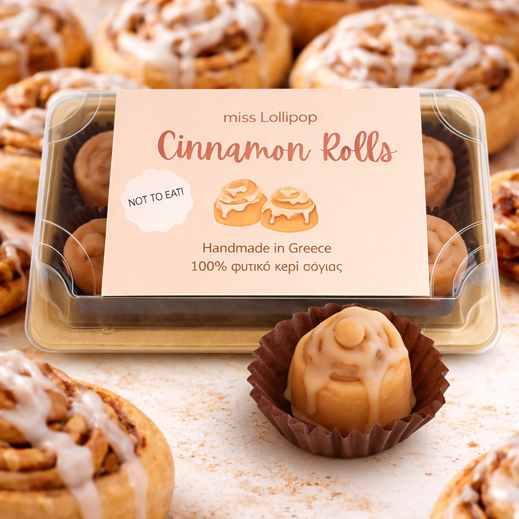 Φτιαγμένα από 100% φυσικό κερί σόγιας, σε απολαυστικό σχέδιο cinnamon roll, προσφέρουν μια πλούσια και γλυκιά αρωματική εμπειρία που θυμίζει φρεσκοψημένα ρολά κανέλας.
